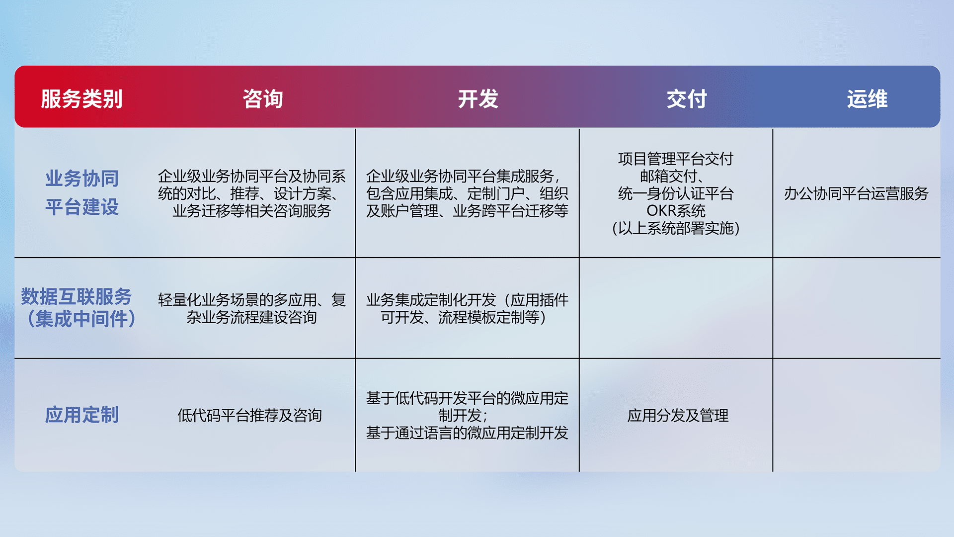 针对钉钉、、、企微、、IDaas等平台级产品提供产品的规划、、、方案、、、、交付、、、、定制化开发等服务,,,,实现如统一协同办公、、、智能客户服务、、混合会议管理、、智能数据查询、、等业务场景,,实现数字化转型。。。